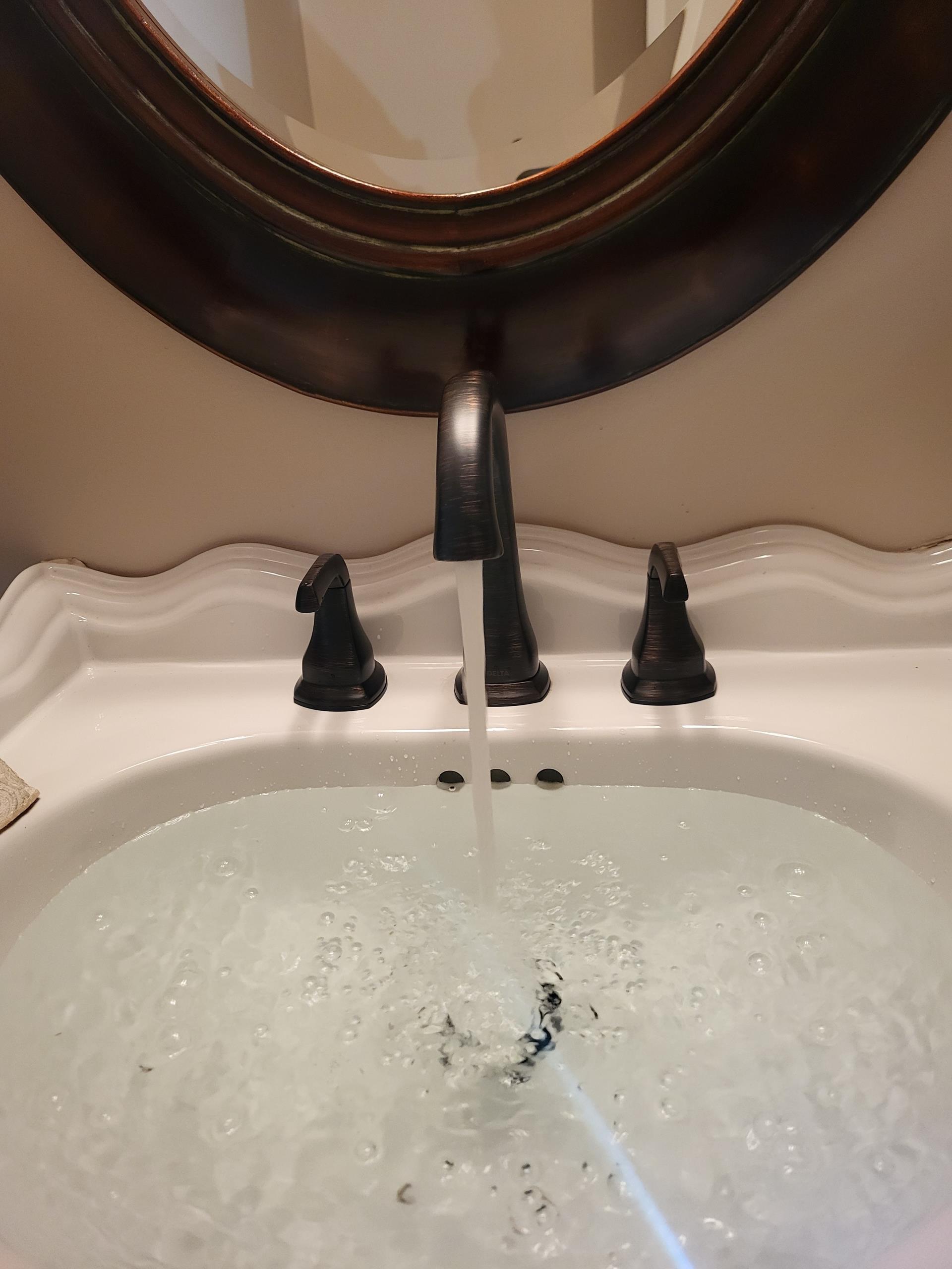 We replaced a customer supplied 8" spread lavatory faucet with pop-up up assembly. Once installation was completed we will test for proper leak free operation.