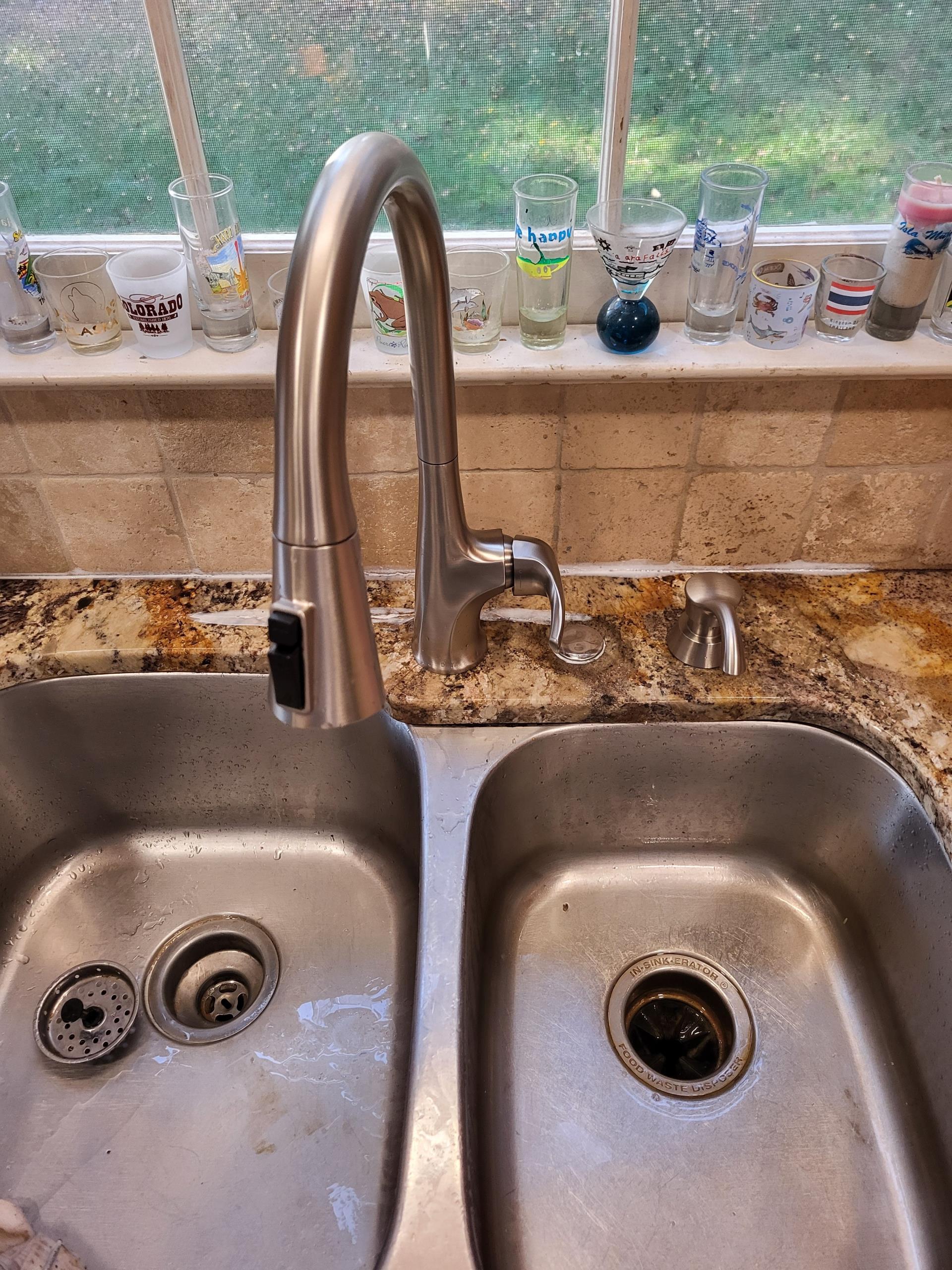 We replaced the leaking kitchen faucet with a new Delta faucet with pull out sprayer. Once installation was completed we tested for leak free operation.